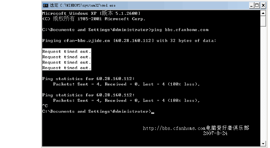 如果你“ping bbs.cfanclub.net”得到如下图的请求失败结果。